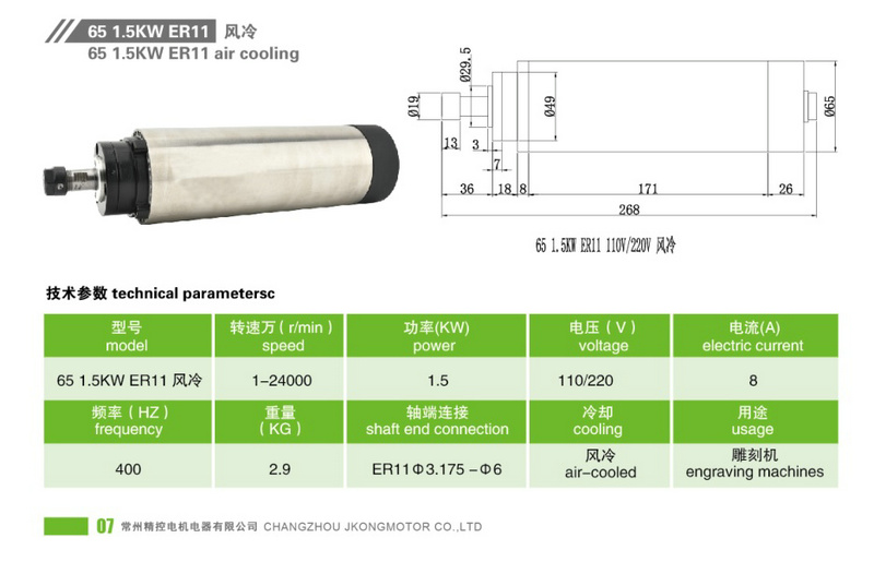 CHANGZHOU JKONGMOTOR CO., LTD sells 2 types of spindle motors for CNC machine, wood carving/engraving machine, which are air cooled type spindle motor from 800W to 7.5kW and water cooled spindle motor from 1.5kW to 6kW. They features with simple and compact configuration, stable performance, reasonable price, high precision bearings, long service life and high speed to 24000rpm. Working at 3 phase 300Hz/400Hz 380V AC power supply, need to be equipped with VFD to use.